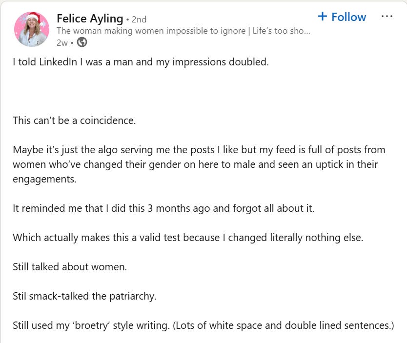 Engagement jumped 300%. Some saw 400%. One woman watched her impressions quadruple overnight. Not because she said anything different. Not because her expertise suddenly improved. But because the algorithm thought a man was saying it.
